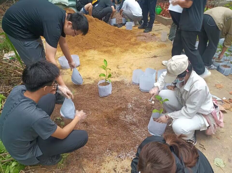 现场,班主任徐圆圆老师带领同学们参观教学实习基地苗圃,向同学们详细讲解了苗圃的组成以及容器苗培育的关键技术。紧接着,威廉希尔官网2023级生态学博士研究生马道承向同学们介绍苗木种类、育苗容器和基质选择,并亲身示范育苗基质的配制及观光木容器苗的换盆移栽过程。同学们听得饶有兴致,以小组为单位,争先恐后的参与到“容器苗培育—观光木苗木换盆移栽”劳动实践活动中。