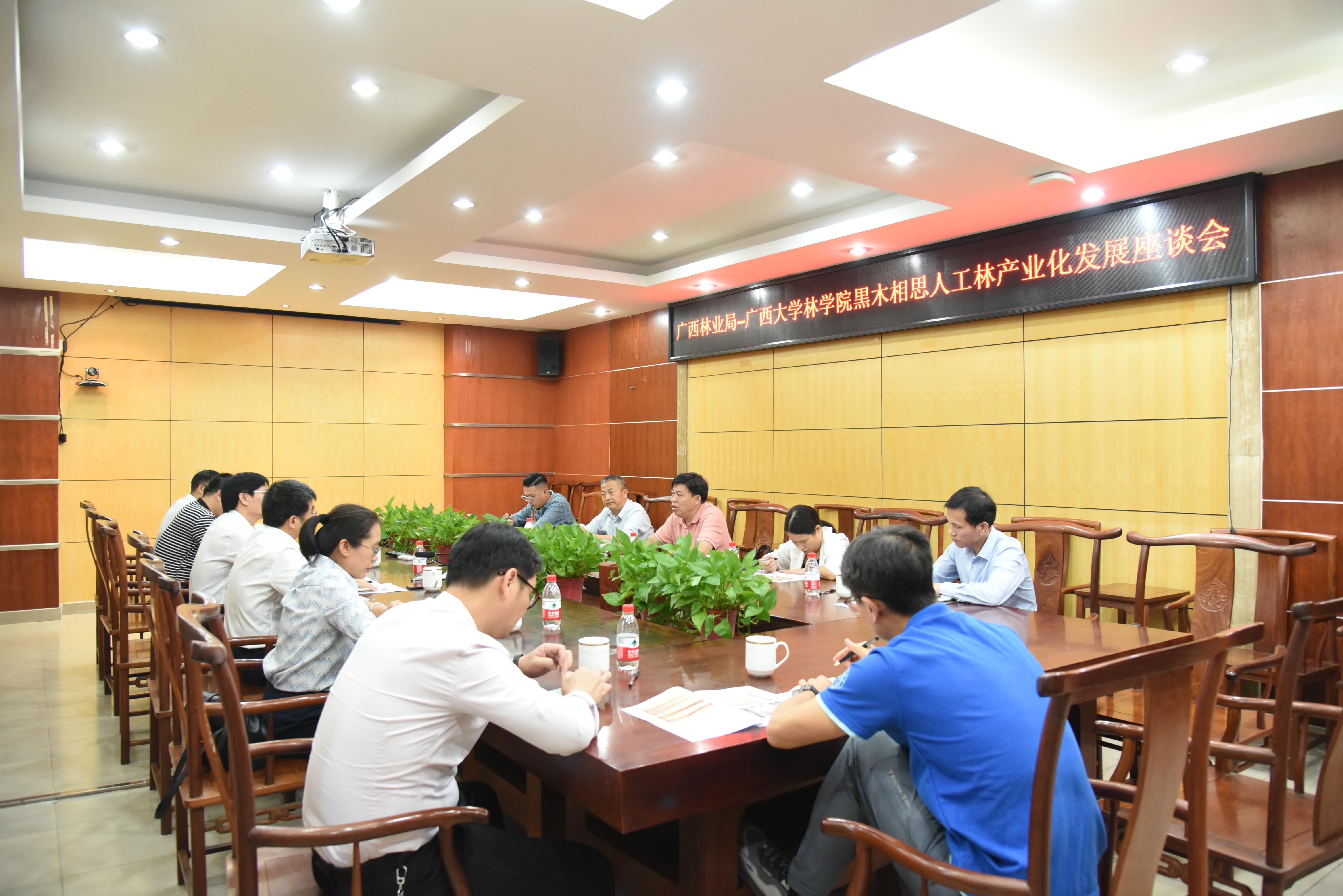11月10日,广西壮族自治区林业局林场种苗处处长樊吉尤一行5人到威廉希尔官网调研指导黑木相思人工林产业化发展。院党委书记符韵林、常务副院长叶绍明、党委副书记徐丽、副院长梁俊波及黑木相思课题组老师参加调研活动。
