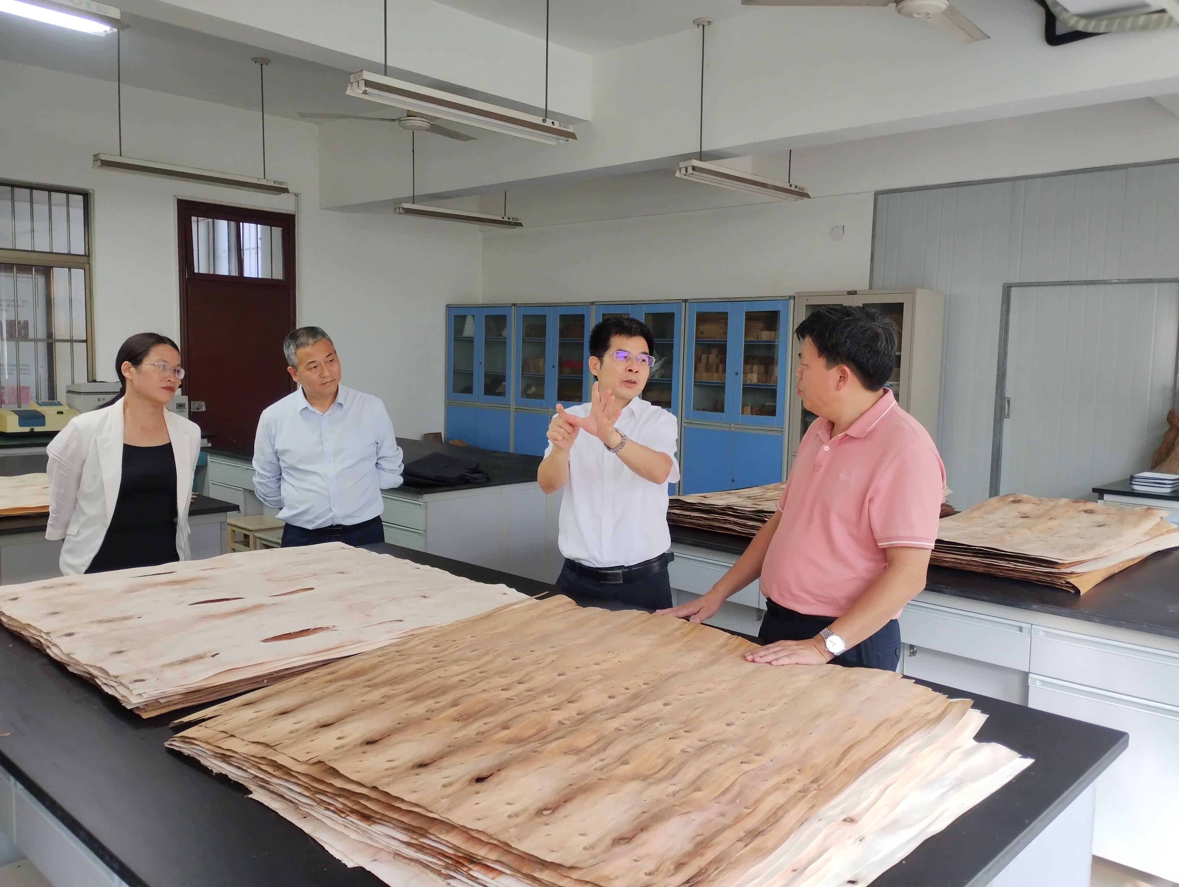 调研组查看黑木相思旋切材(右一:樊吉尤)