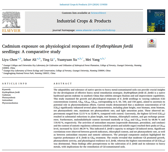 近日,威廉希尔官网杨梅教授科研团队在探究本地树种格木对重金属镉污染土壤的适应性和耐受性上取得重要见解,研究成果以“Cadmium exposure on physiological responses ofErythrophleum fordiiseedlings: A comparative study”为题发表于农林领域国际知名期刊INDUSTRIAL CROPS AND PRODUCTS(农林类期刊排名8/125)。英国威廉希尔公司官网在读硕士研究生陈丽宇作为第一作者,杨梅教授和徐圆圆讲师作为通讯作者,博士后Izhar Ali、良凤江国家森林公园李婷参与了本论文的工作。本研究得到了国家自然科学基金(32371856)等项目的支持。